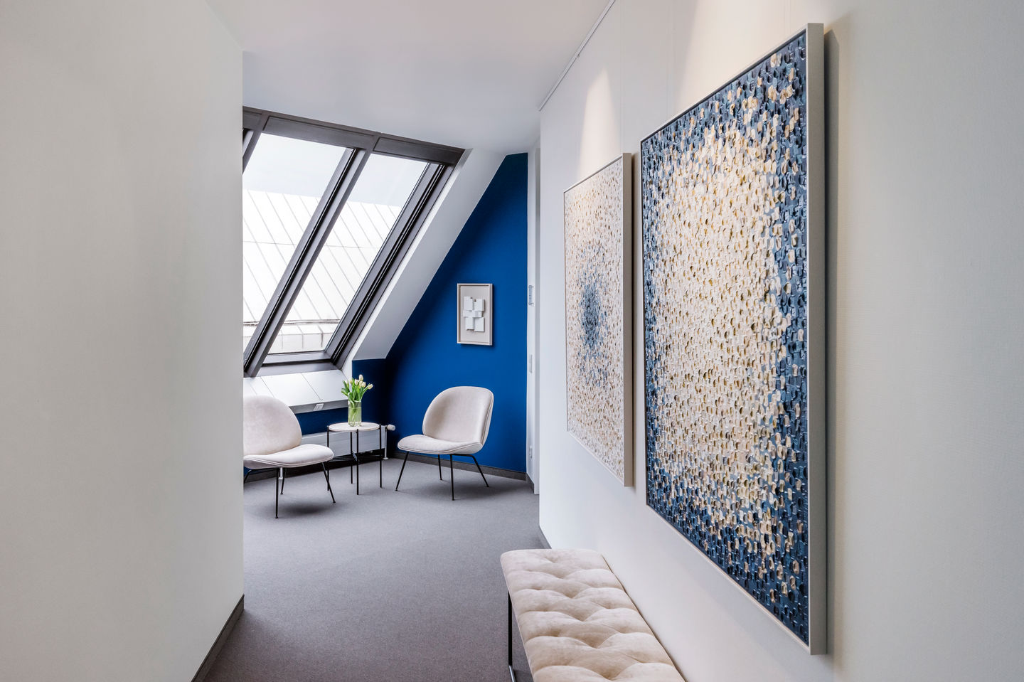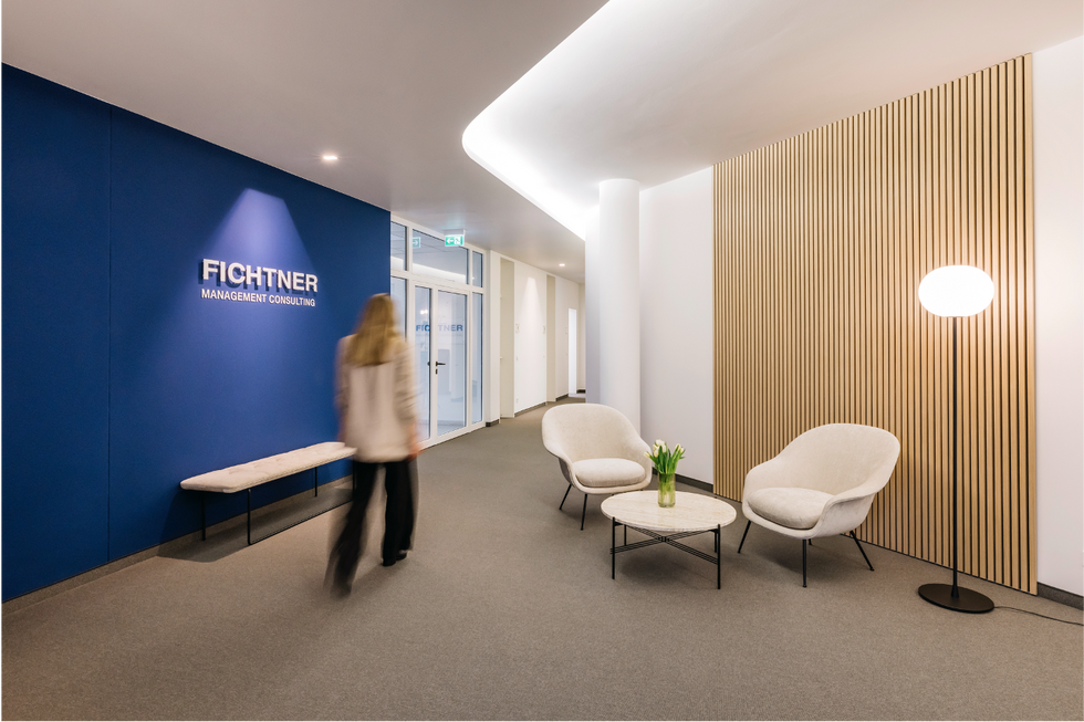 Mit einem auf die CI des Unternehmens abgestimmten Design wurde ein stimmiges Konzept entwickelt, das den modernen Zeitgeist der Management Consulting widerspiegelt. Unterstützt von ausgewählter zeitgenössischer Kunst lädt das umgestaltete Office die Mitarbeiter ein, wieder verstärkt an ihren Arbeitsplatz zu kommen. Kernstück des Konzeptes ist die Mitarbeiter-Lounge die einen alten Besprechungsraum abgelöst hat.